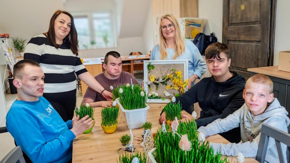 Uczniowie z grupy „C” (II Etap Edukacyjny) z dumą prezentują efekty swojej pracy. Z samodzielnie wyhodowanej pszenicy przygotowali piękne, zielone dekoracje, które już niedługo ozdobią nasze wspólne śniadanie wielkanocne.